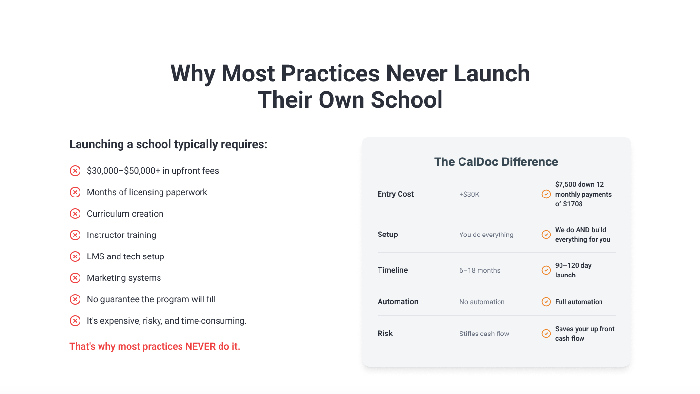 I found CalDoc and they took on the responsibility of providing a ready to go program, then provided the curriculum in its entirety, trained me and my staff on all kinds of school aspects, then insured through aggressive marketing to drive students to my school. I like their set up since I'm mostly hands off to a large extent. The fees they get are very low for work they do and the technologies they provide, and it doesn't affect my bottom line. The amount of money I saved from developing anything from scratch far outweighs their initial (and much lower) startup cost. Yes there are monthly fees, but my first class had already provided my ROI fairly quickly. It's just a much Just a more fair and better pathway for colleagues without having to put out $42k as with that other company, so it's easy on the pocketbook - and very fair.