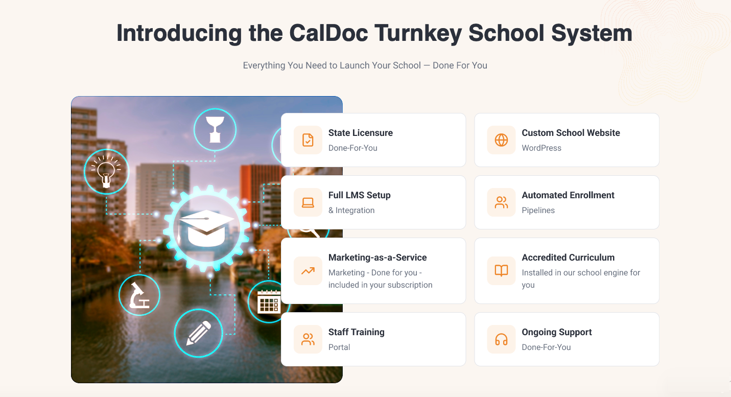 CalDOC eliminates all of that. We handle the entire process from startup to launch without the heavy financial burden, allowing you to see a return on investment with your very first cohort of just eight students.